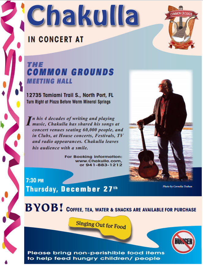 Chakulla returns to the Common Grounds for a three-concert series performed over three successive months. Common Grounds Meeting Hall 12735 Tamiami Trail North Port, FL 34287