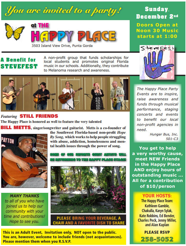 Fundraiser Concert: “Party with a Purpose”! Advanced Auto on 1183 N. Toledo Blade Blvd. in North Port, Florida is teaming up with the Hunger Bus having a Party to Benefit: the All Faiths Food Bank! Burgers, Dogs, Sodas and Water all for a dollar donation each. Bouncy House, Rock Painting, Prizes and Give aways. Family Fun and celebration! Chakulla will be making Music throughout afternoon! This Event is FREE! Monetary and non-perishable Donations excepted! Help Feed Hungry Children/People!